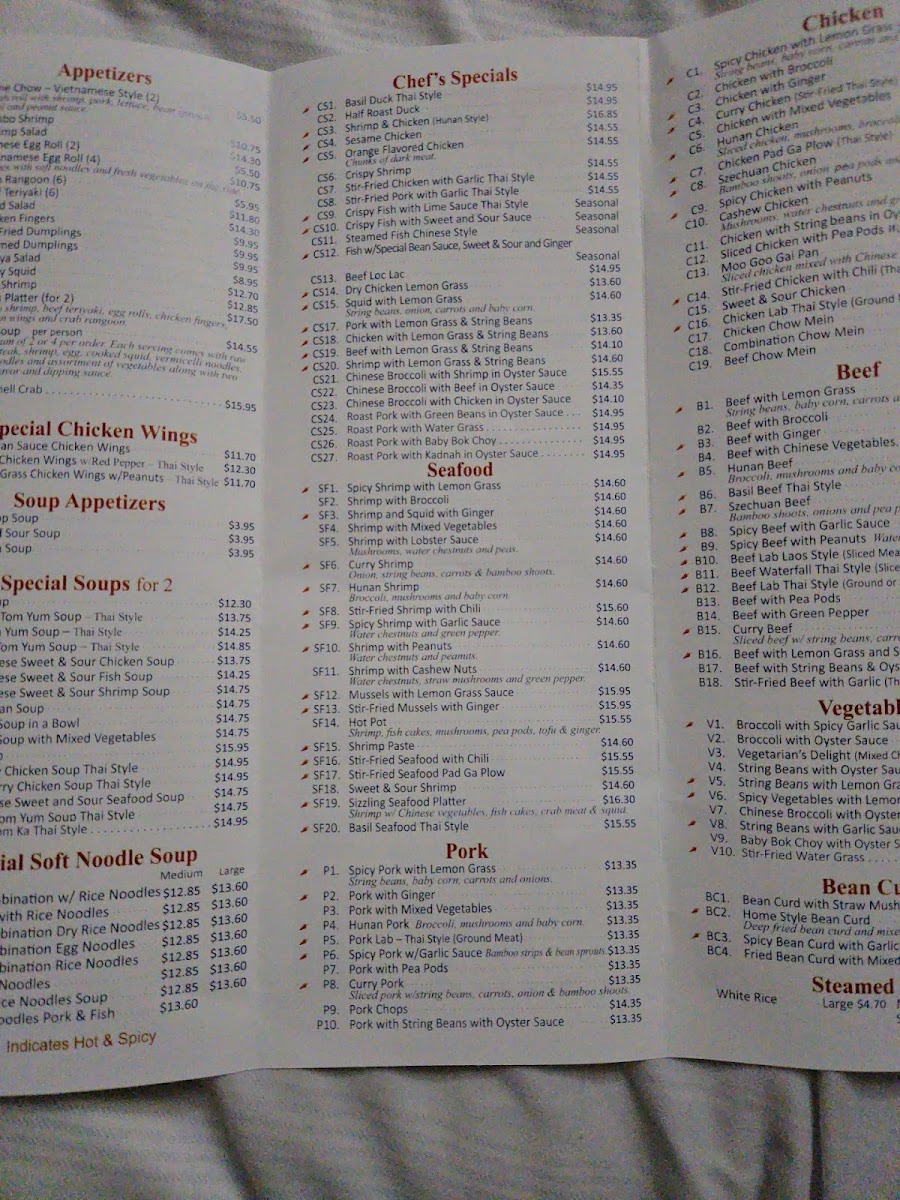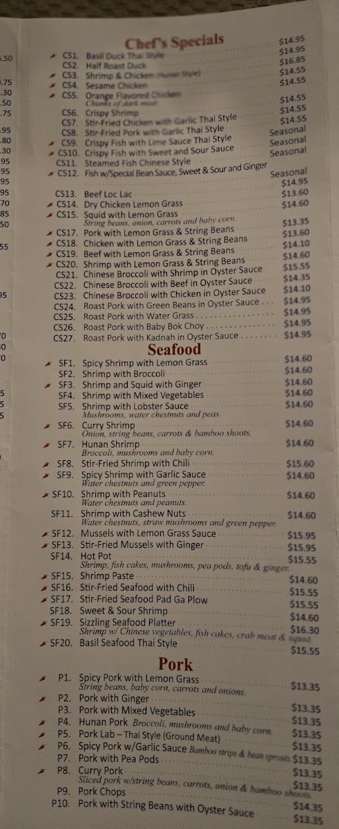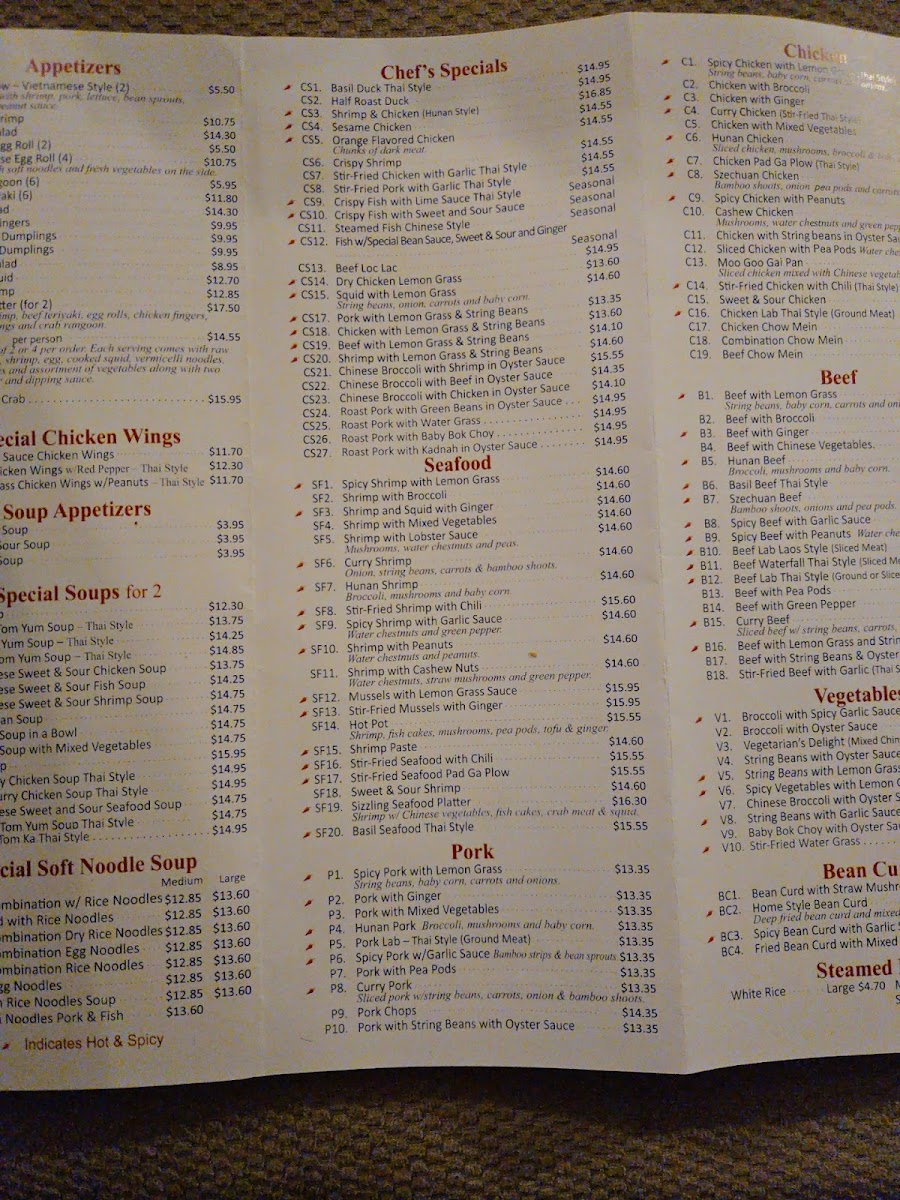 - Wings and Specialties: Highlights include hot wings, lemongrass wings, duck dishes, fried whole fish with lime sauce, and grilled or steamed fish options like sea bass.