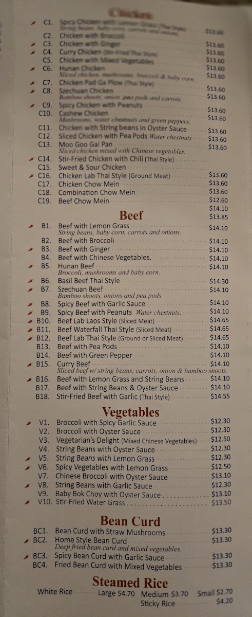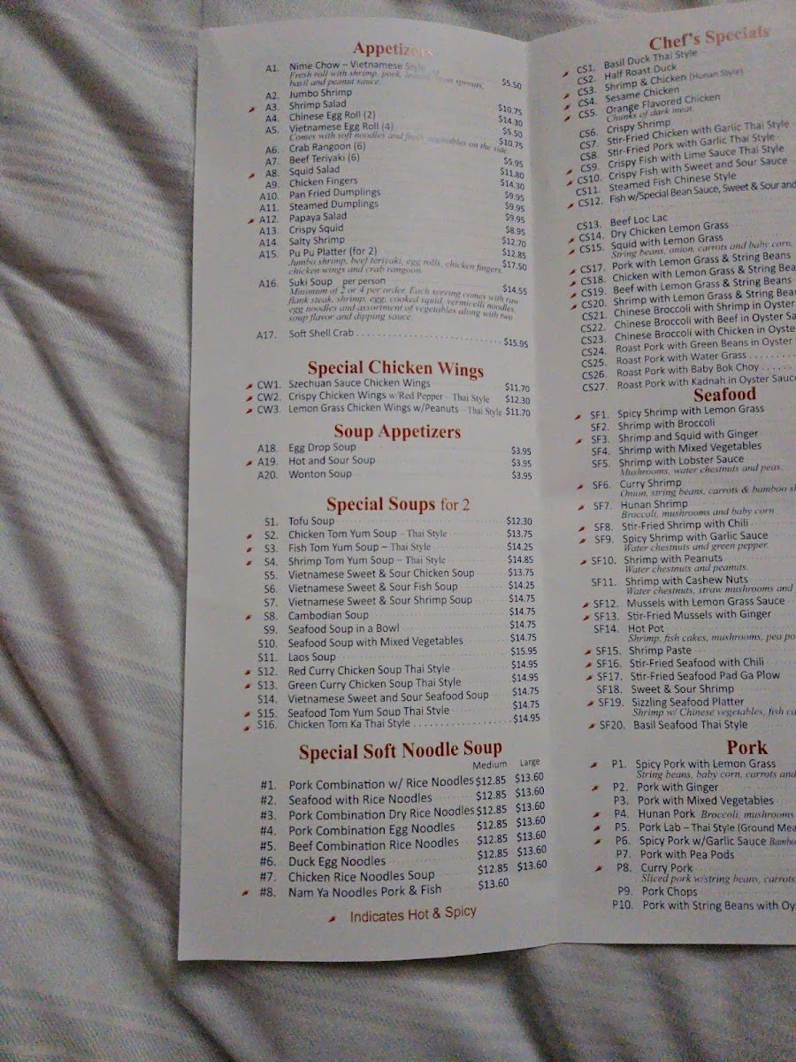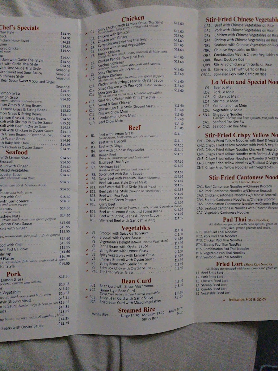 - Appetizers and Light Bites: Includes popular items such as spring rolls, egg rolls, crab rangoon, steamed dumplings, and Cambodian lemongrass beef skewers, providing options for starters or smaller plates.