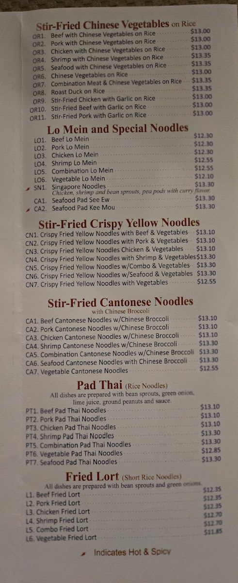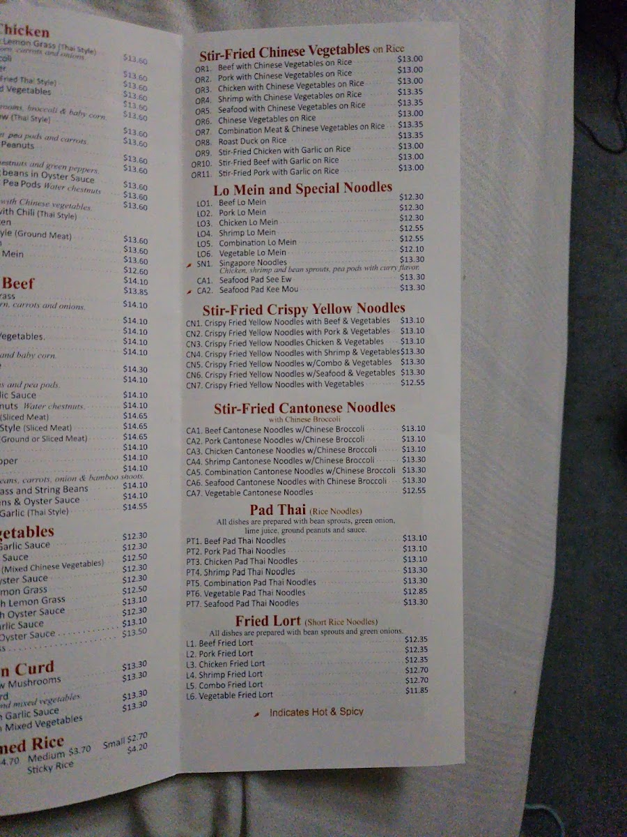 - Rice and Noodle Dishes: Various fried rice selections are available, including beef, pork, chicken, shrimp, and vegetarian versions, as well as noodle dishes like Pad See Ew and Bee Boong with multiple protein or vegetable choices.